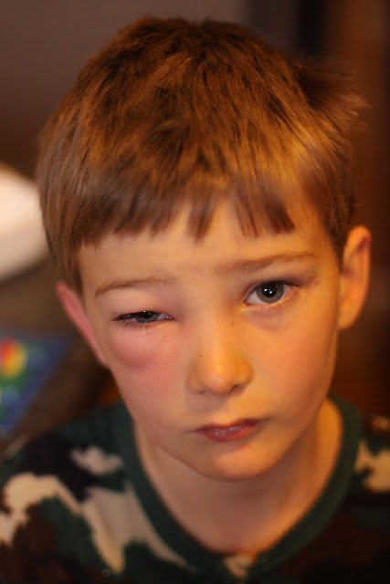 So...we've been having so much fun with our new bees! The other night some family members came over just to see them. Well, the temp dropped and they came over later than our original plan. So, all of the bees were inside the hive, which is when you are really not supposed to mess with them. However, we've done it before..no problem. Well, there is one area we're really trying to help Christy with lately. SHe grew up having to perform and fight for attention anytime there were visitors around her in the orphanage. That instinct is still there...you can see it click in her as soon as someone new is around or we're in a new place. Even if it's negative attention...she has to try to get it. So, in front of our guests, in attempt to steal the show, she runs and bangs on the hive. Apparently the bees didn't like that and went into attack mode. Thankfully no one is allergic (we needed to know anyways) and they look a lot worse than they feel. Chad and I got stung but barely had a reaction at all. It felt like a mosquito bite for a couple of days.